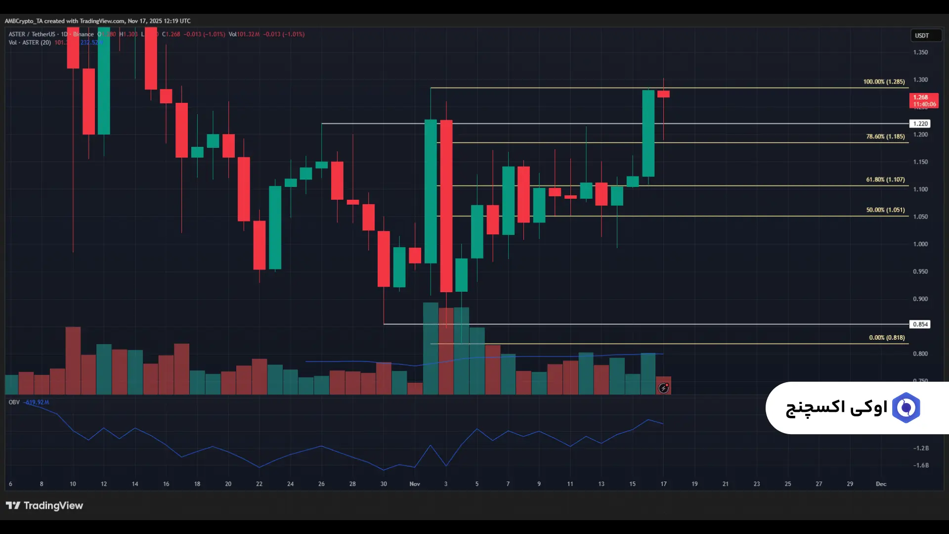 علاوه بر این، رشد پایدار قیمت با افزایش شاخص OBV (On-Balance Volume) همراه بوده که نشاندهنده فشار خرید مداوم است. در زمان نگارش این تحلیل، قیمت آستر در حال به چالش کشیدن سقف محلی نزدیک به ۱.۲۸۵ دلار است و میتواند برای یک حرکت صعودی دیگر تلاش کند.
