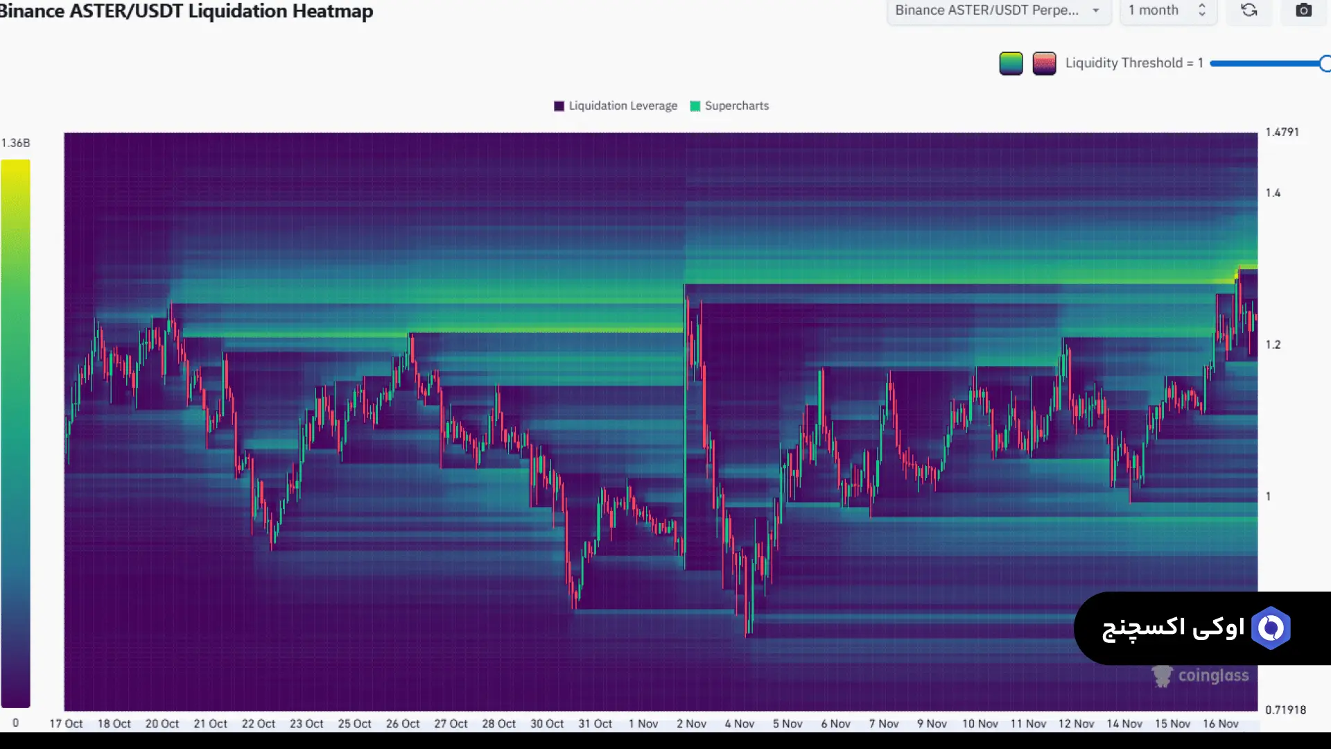 نقشه حرارتی لیکوئیدیتی (Liquidation Heatmap) نشان میدهد که منطقه جذاب بعدی برای قیمت، محدوده ۱.۳۱ تا ۱.۳۵ دلار است. این محدوده نسبتاً به قیمت فعلی نزدیک است و یک خوشه متراکم از سطوح لیکوئید شدن را تشکیل میدهد.