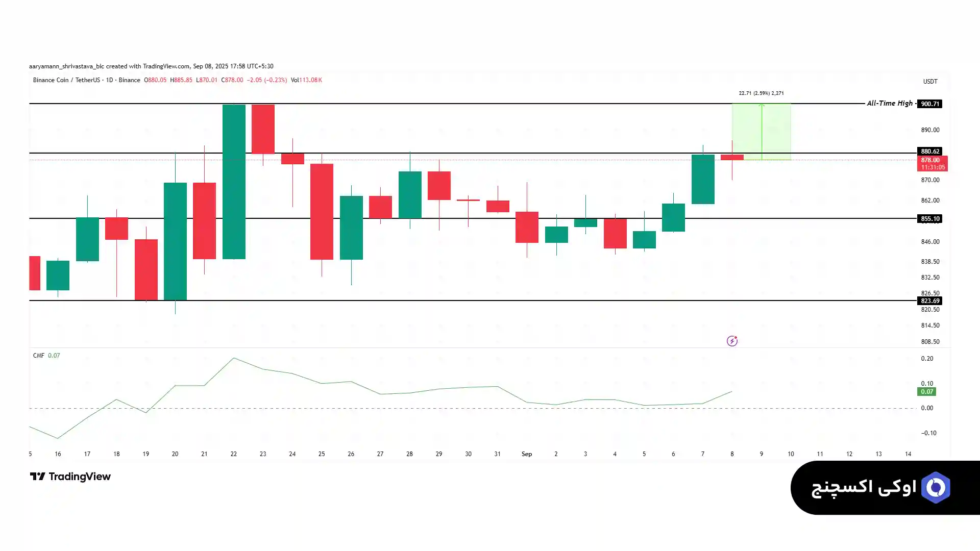 ارز دیجیتال بایننس کوین (Binance coin) ، تنها ۲.۶ درصد فاصله از نقطه اوج خود یعنی ۹۰۰ دلار فاصله دارد. به همین دلیل به نظر میرسد که قیمت بایننس کوین در موقعیت خوبی برای افزایش بیشتر قرار دارد. جریان های ورودی قوی از این روند پشتیبانی می کنند، به طوری که شاخص جریان پول چایکین (CMF) بالای خط صفر قرار دارد.