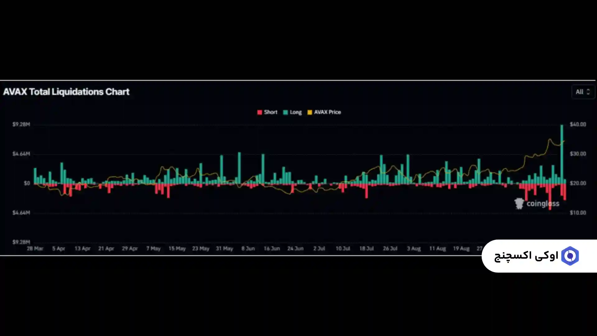 تقریباً ۲.۸ میلیون دلار موقعیت فروش (شورت پوزیشن) در ۲۴ ساعت گذشته لیکویید شد. هرچند این رقم در مقایسه با ۹.۲ میلیون دلار پوزیشن های لانگی که روز دوشنبه لیکویید شدند (بزرگترین حجم لیکویید در ماه های اخیر)، بسیار کمتر بود.