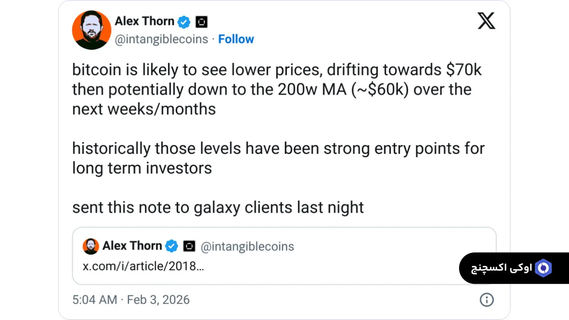 الکس تورن، مدیر تحقیقات این شرکت، معتقد است که در هفته‌های پیش‌رو احتمال حرکت قیمت بیت کوین به سمت ناحیه‌های پایین‌تر وجود دارد؛ به‌ویژه محدوده ۷۰ هزار دلار که از نظر ساختار عرضه و تقاضا یک سطح مهم به شمار می‌رود. در سناریوی بدبینانه‌تر، بازار می‌تواند پس از آن به سمت سطح بسیار مهم قیمت تحقق‌یافته حرکت کند.