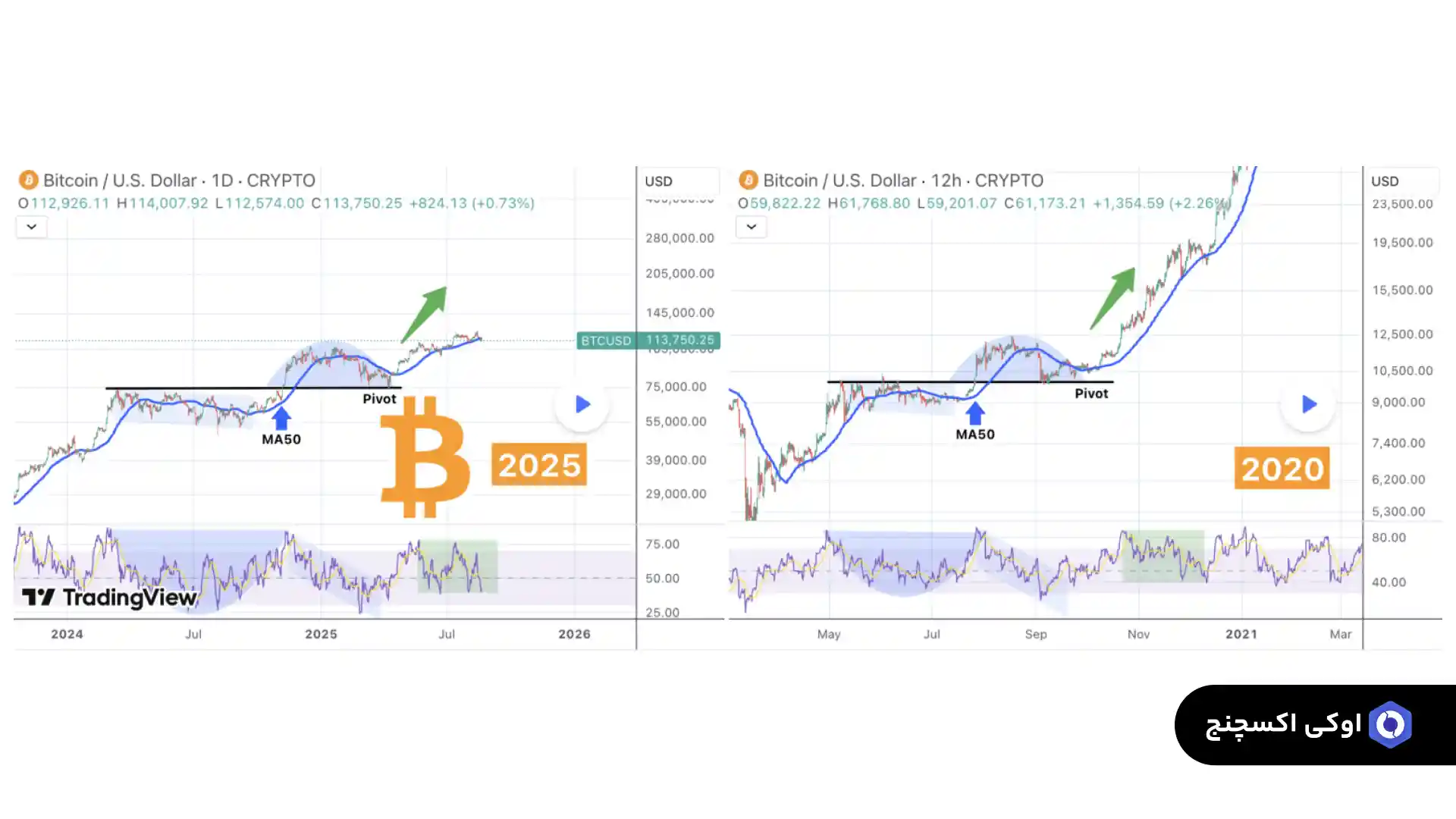 - الگوی فعلی قیمت و RSI مشابه سال ۲۰۲۰ است که میتواند به صعود قابل توجه بیت کوین منجر شود.