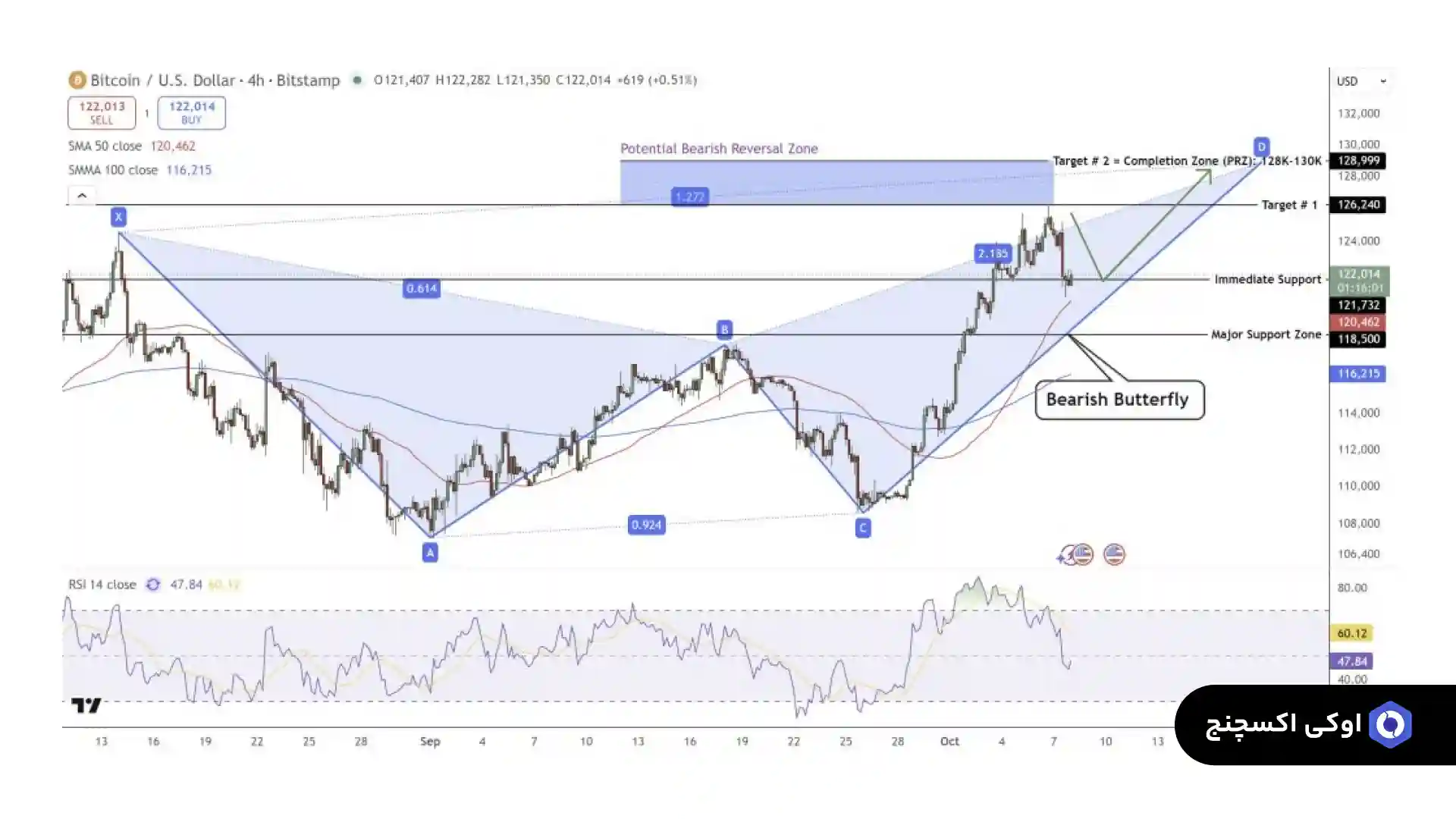 نمودار تحلیل بیت کوین، الگوی پروانه نزولی را نشان می دهد که به محدوده بازگشت بالقوه (PRZ) خود بین ۱۲۸۰۰۰ تا ۱۳۰۰۰۰ دلار نزدیک می شود، در این محدوده ممکن است سطح مقاومت موقت ظاهر شود. با این حال، شاخص قدرت نسبی (RSI) تا سطح ۴۸ کاهش یافته است که نشان دهنده تثبیت سالم پس از مقادیر اشباع خرید قبلی است.