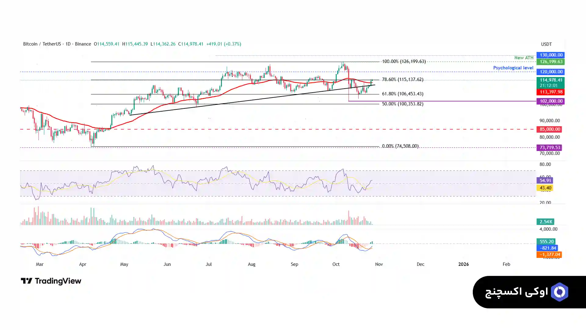 روند صعودی بیت کوین (Bitcoin) برای دستیابی به هدف ۱۲۰،۰۰۰ دلار شروع شده است. قیمت بیت کوین روز چهارشنبه در حدود سطح اصلاحی فیبوناچی ۶۱.۸٪ (که از پایین ترین سطح آوریل، ۷۴،۵۰۸ دلار، به بالاترین سطح ۱۲۶،۱۹۹ دلار رسیده است) در محدوده ۱۰۶،۴۵۳ دلار، حمایت پیدا کرد.