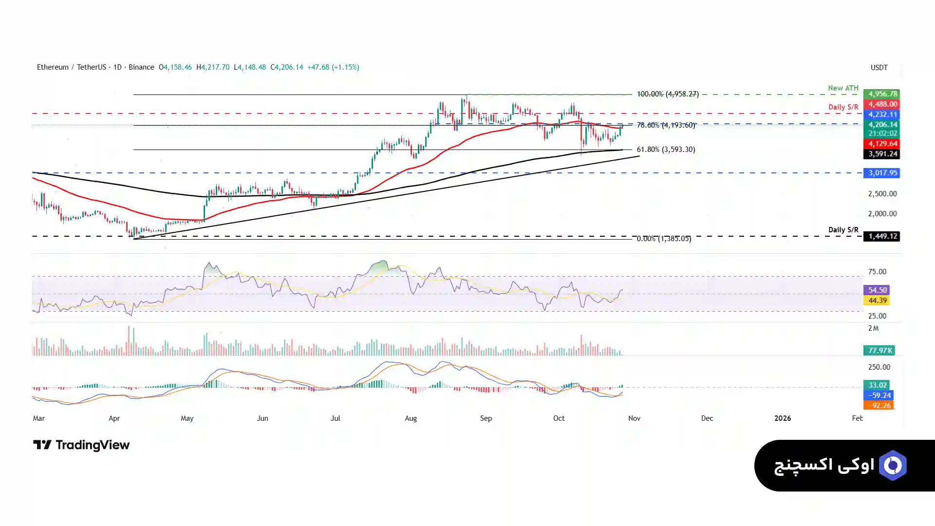 اگر قیمت اتریوم در آینده سطح مقاومت روزانه ۴۲۳۲ دلار را بشکند و بالاتر از آن بسته شود، می تواند روند صعودی خود را تا مقاومت روزانه بعدی در محدوده ۴۴۸۸ دلار ادامه دهد. مانند ارز بیت کوین، RSI و MACD اتریوم نیز روند صعودی را نشان می  دهند که از رشد ارزها حمایت میکند.