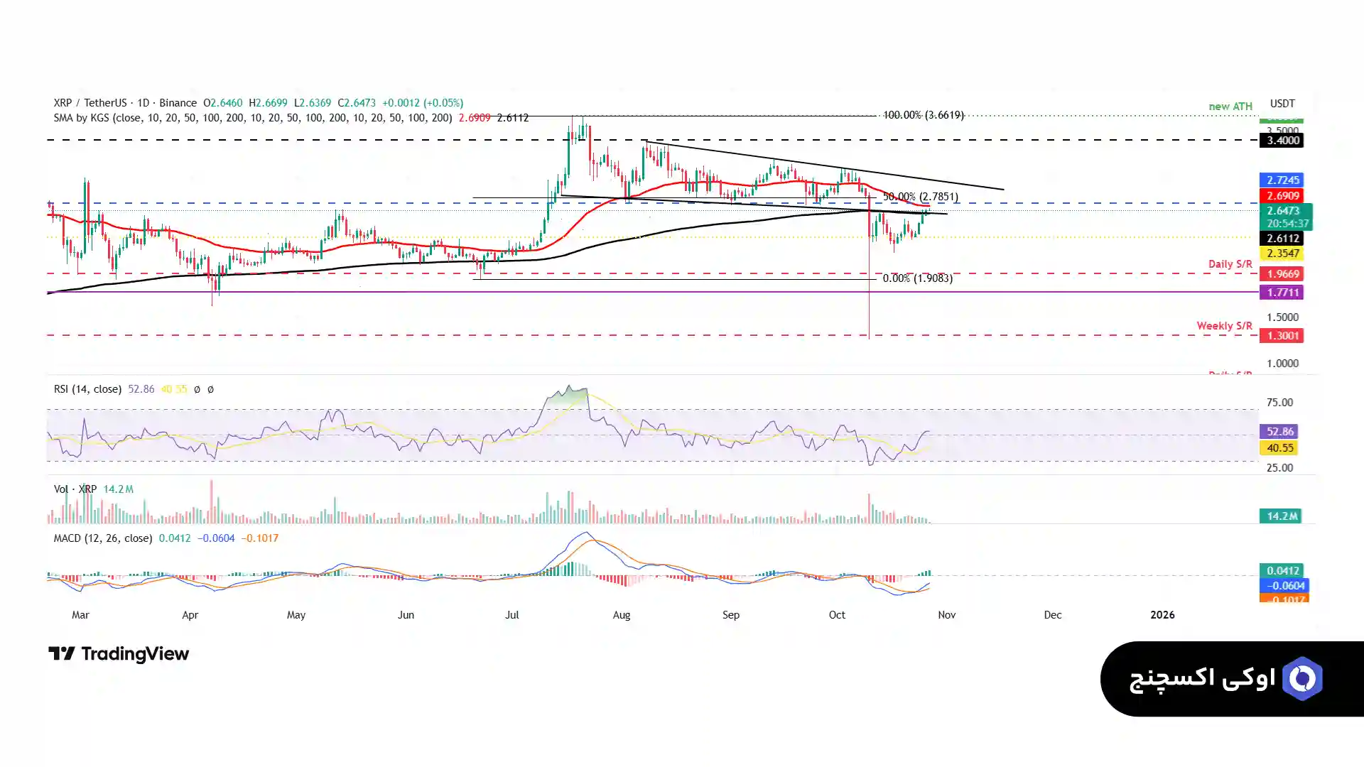 اگر قیمت ریپل در آینده سطح مقاومت کلیدی ۲.۶۹ دلار را بشکند و بالاتر از آن بسته شود، می تواند تا مقاومت روزانه بعدی در ۳.۴۰ دلار افزایش یابد. مانند بیت کوین و اتریوم، شاخص RSI و MACD ریپل (XRP) نیز حرکت صعودی را نشان می دهند و از دیدگاه صعودی حمایت می‌کنند.