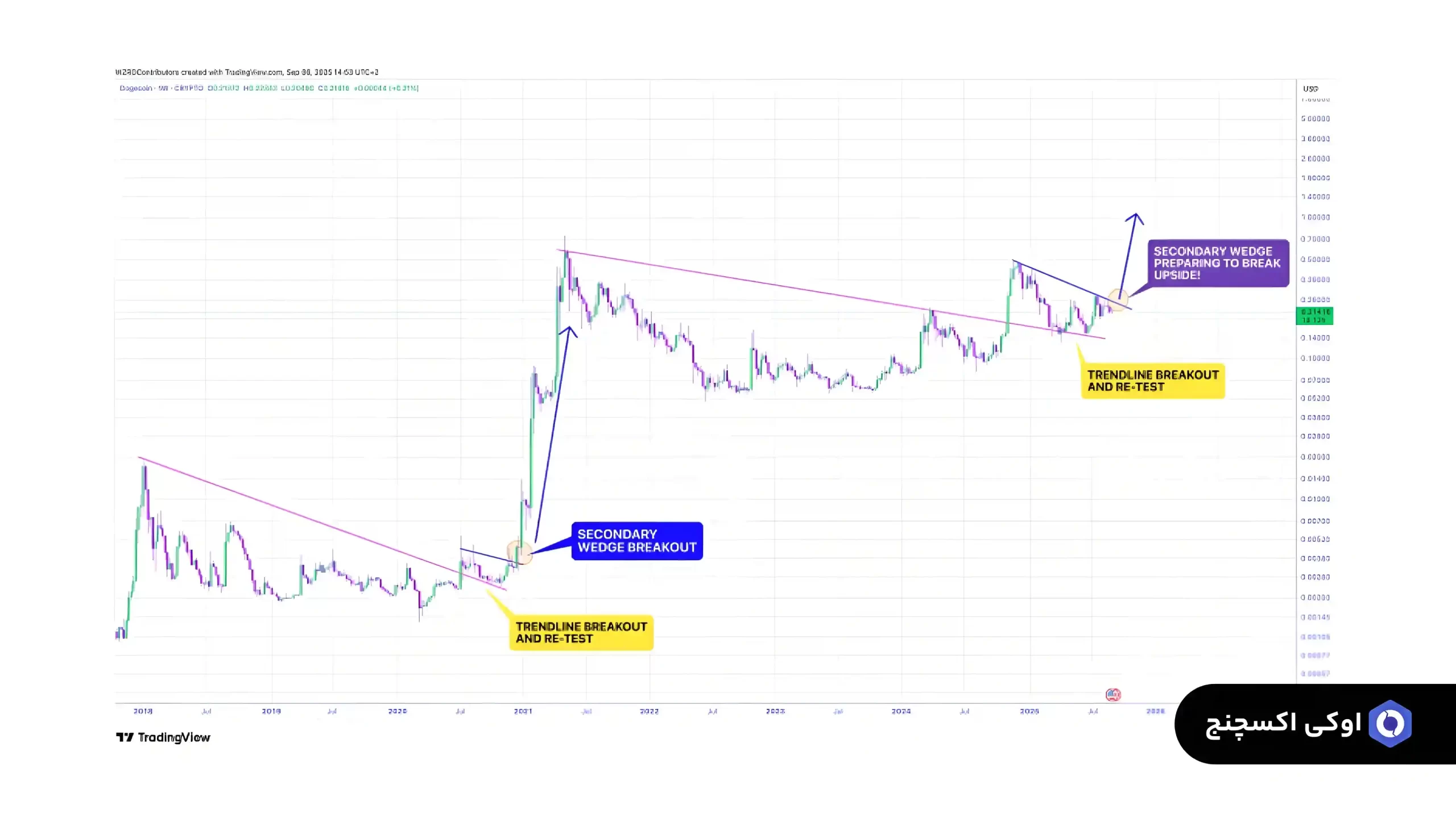 تحلیل تکنیکال دوج کوین (Dogecoin) نشان میدهد که این میم کوین (memecoin) در موقعیت شکست از الگوی کنج ثانویه قرار دارد و اهداف قیمتی آن بر اساس الگوهای چرخه تاریخی به سطح ۱ دلار اشاره دارد.
