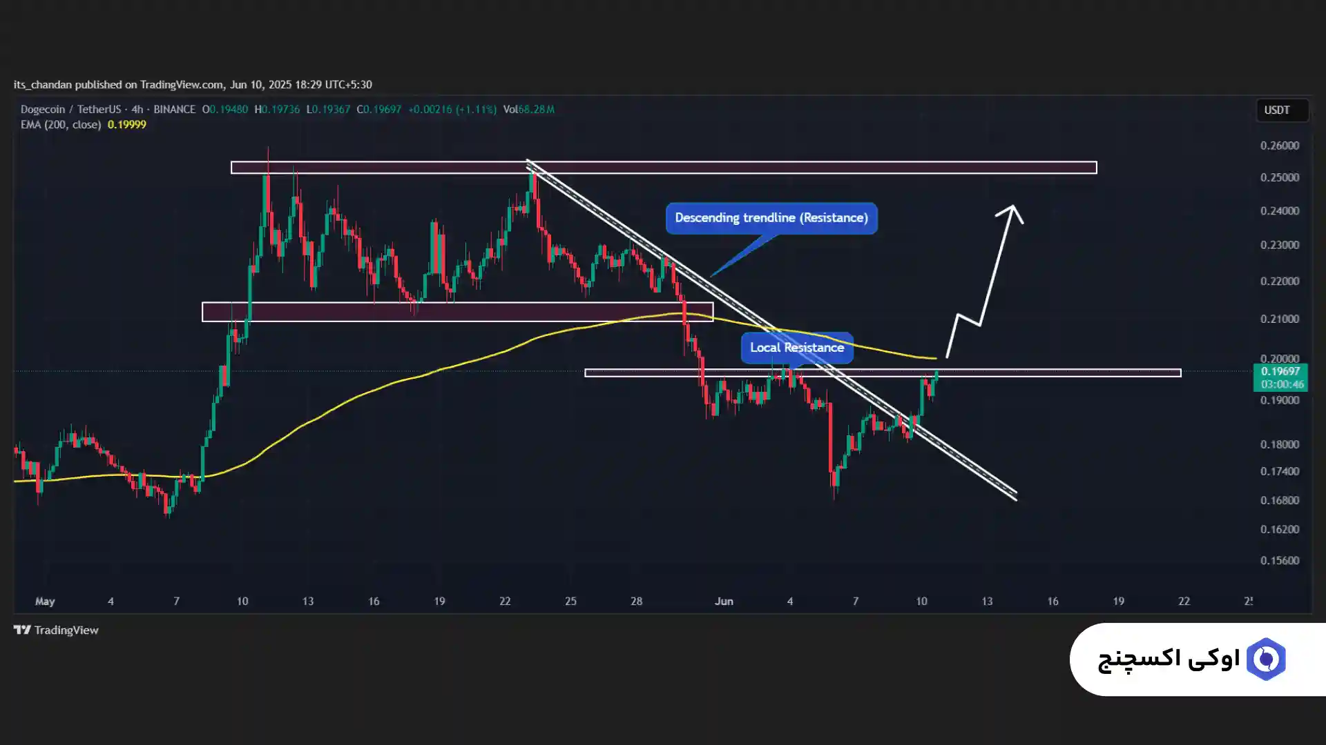 اگر دوج کوین (Dogecoin) بتواند یک نمودار شمعی روزانه بالای ۰.۱۹۸۵ دلار ببندد، احتمال یک جهش قوی به سمت ۰.۲۵ دلار وجود دارد که معادل رشدی ۲۵ درصدی از سطوح فعلی است.