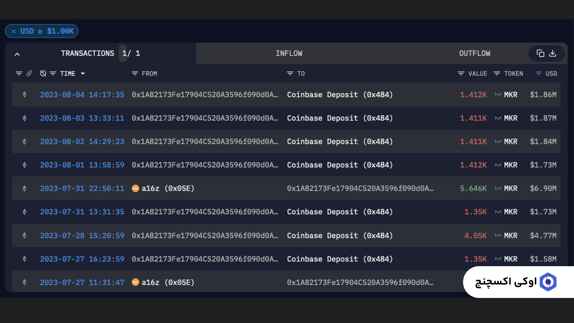 در اواخر ژوئیه ۲۰۲۳، a16z بیش از ۱۰ میلیون دلار از توکن های MKR خود را به صرافی کوینبیس (Coinbase) منتقل کرد. این حرکت با یک سقف محلی در قیمت MKR همزمان بود که در هفته بعد ۱۲.۵٪ کاهش یافت.