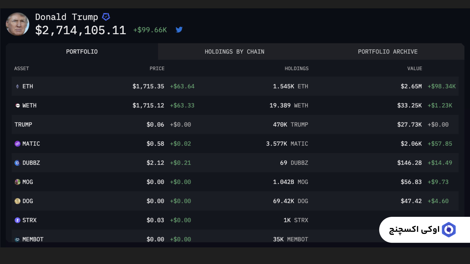 به عنوان مثال، در تصویر زیر میتوانید داراییهای بهروز کیف پولی که به احتمال زیاد متعلق به دونالد ترامپ (Donald Trump) است را ببینید: