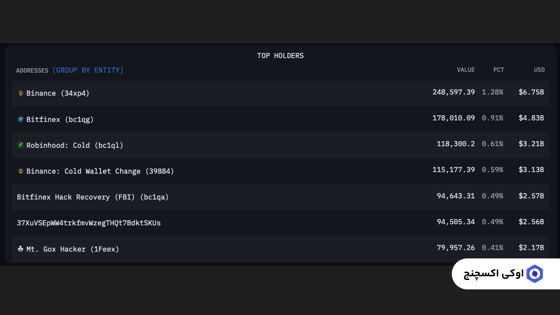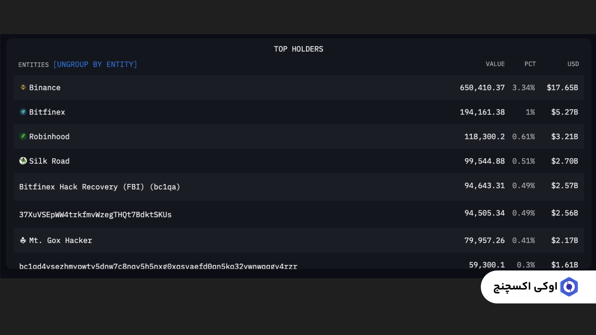 علاوه بر این، می توان بزرگترین هولدرهای یک توکن خاص را بر اساس نهاد لیست کرد تا بزرگترین دارندگان بیت کوین را بر اساس شخص/مؤسسه بررسی کنیم، نه بر اساس بزرگترین کیف پول فردی: