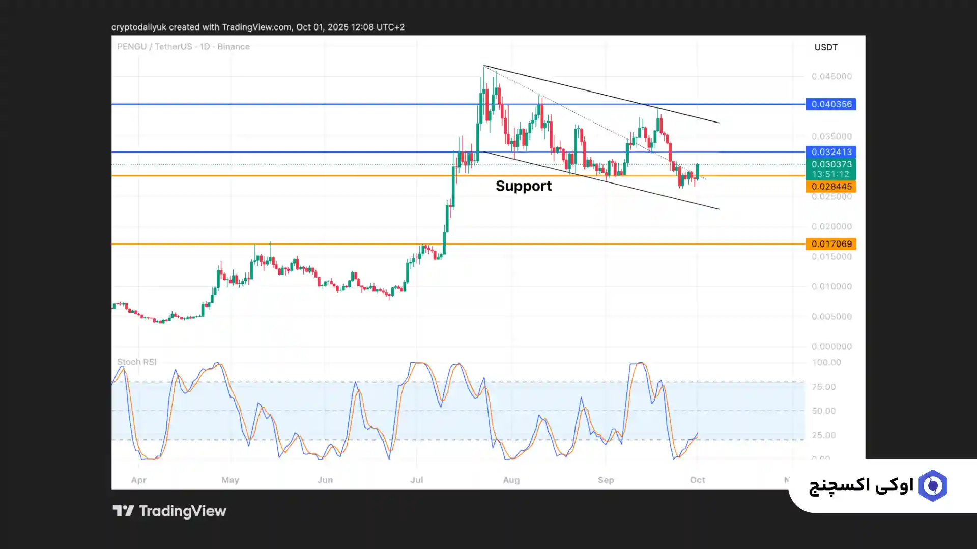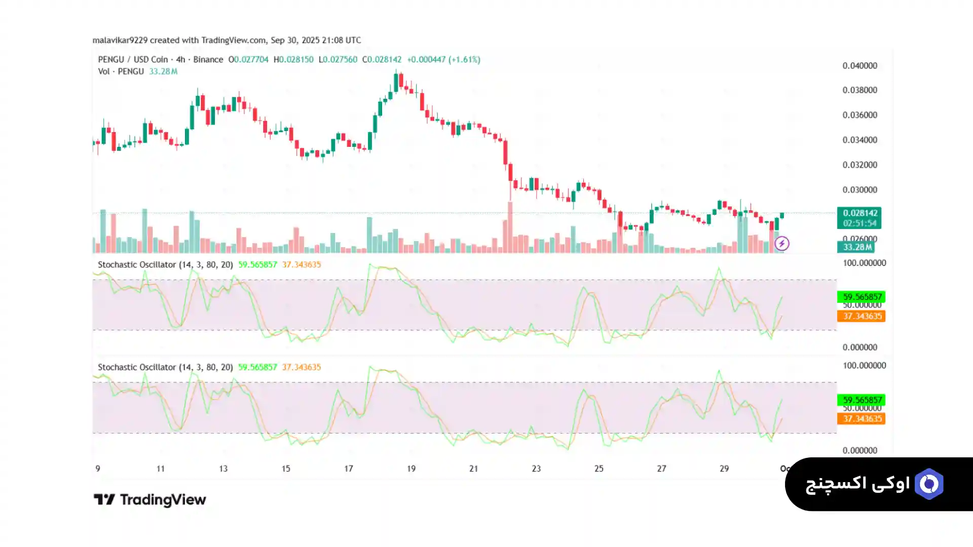 رمز ارز PENGU در اواسط سال ۲۰۲۴، با نماد پنگوئن عرضه شد که توکن بومی پلتفرم puddgy pengu می باشد. نمودارهای اخیر TradingView نشان می دهد که این توکن از شرایط اشباع فروش بازگشته است و نوسانگر تصادفی در محدوده ۳۰-۴۰ قرار دارد. این شاخص معمولاً به حرکت صعودی اشاره دارد. خریداران در حال بازگشت به بازار هستند، اما قیمت ارز Pengu هنوز سطحی از مقاومت دارد که باید قبل از هرگونه رشد واقعی شکسته شود.