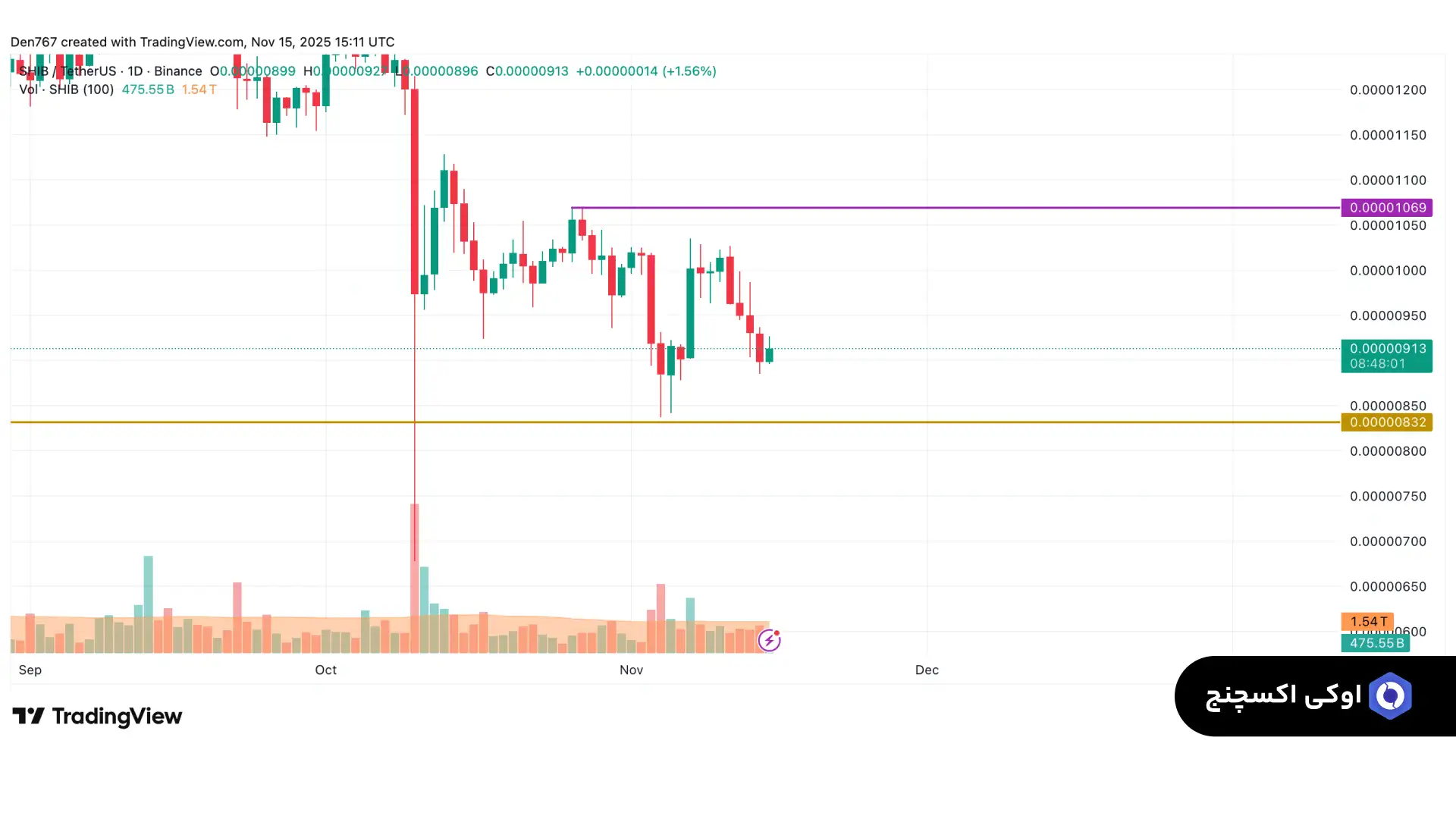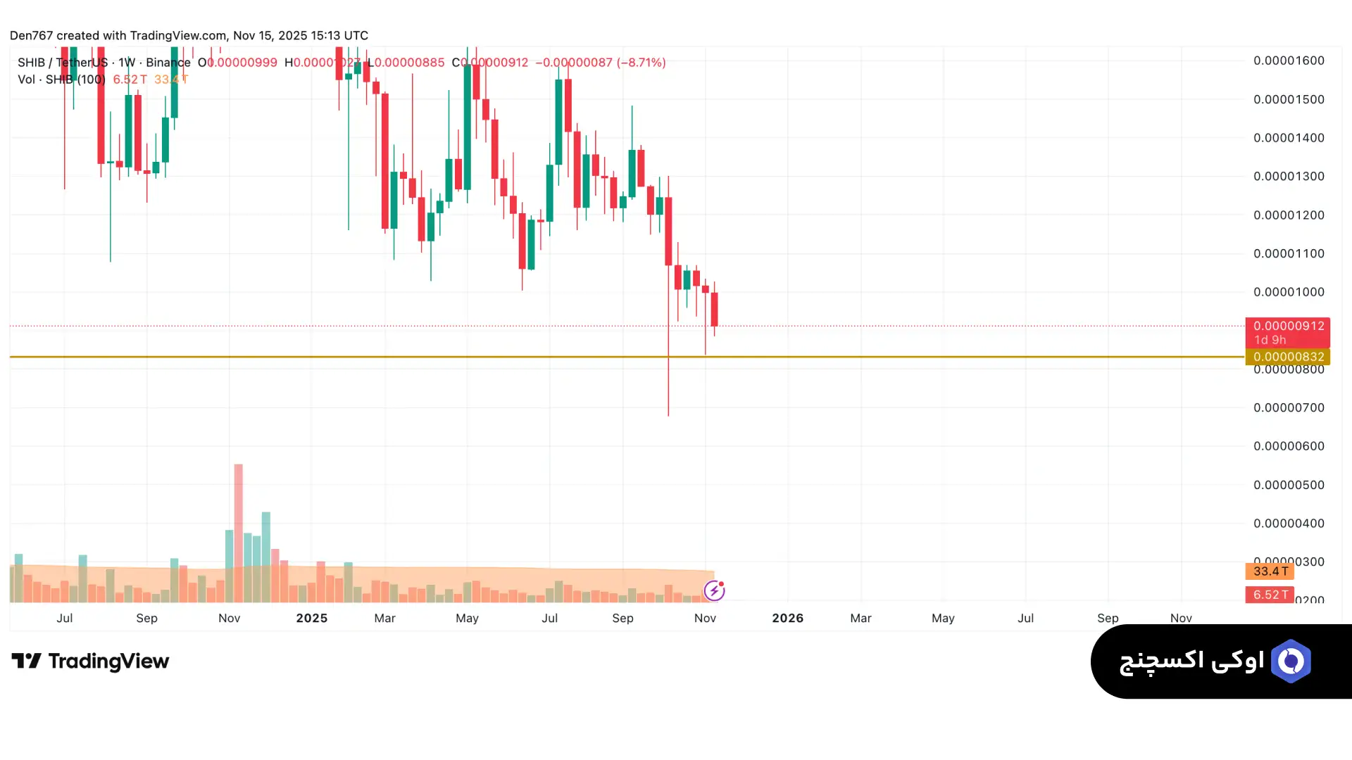 در تایمفریم روزانه (1D)، هنوز هیچ سیگنال بازگشتی یا صعودی مشاهده نمیشود. اگر کندل روزانه نزدیک به کف کندل روز گذشته بسته شود، میتوان انتظار داشت که روند نزولی تا محدوده ۰.۰۰۰۰۰۸۵۰ دلار ادامه پیدا کند. این سناریو تا پایان هفته آینده محتمل است.