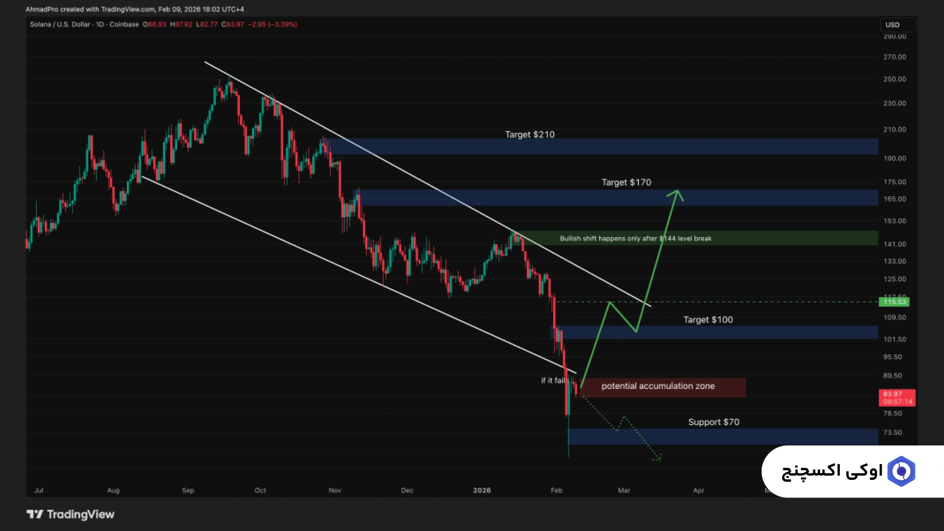 - محدوده ۸۵ تا ۹۰ دلار حمایت کوتاهمدت سولانا است و از دست رفتن آن، سناریوی حرکت به سمت ۷۰ دلار را فعال میکند.