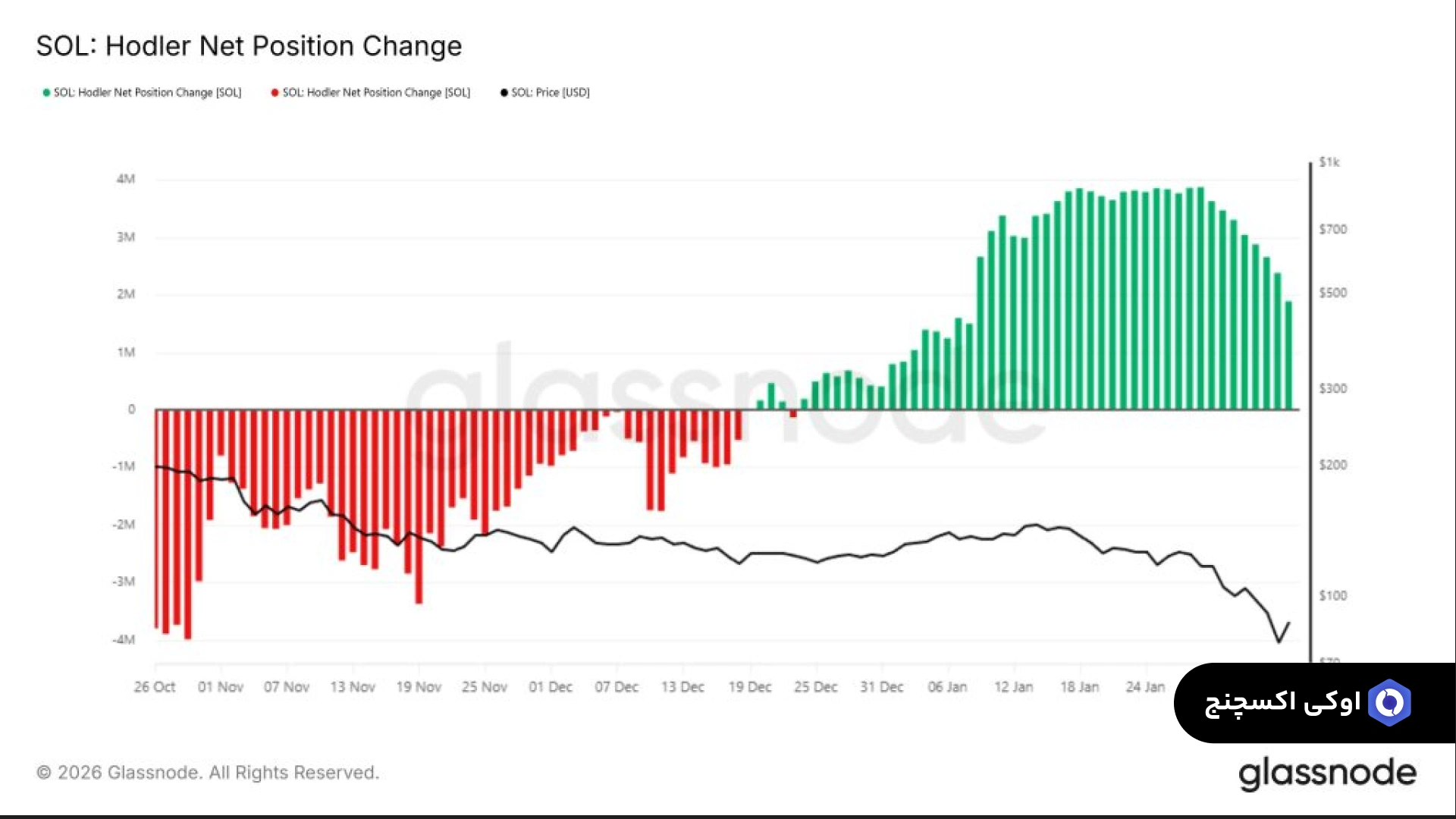 بر اساس دادهی شاخص HODLer Net Position Change، میزان انباشت توسط سرمایهگذاران بلندمدت سولانا بهطور محسوسی کاهش یافته است.