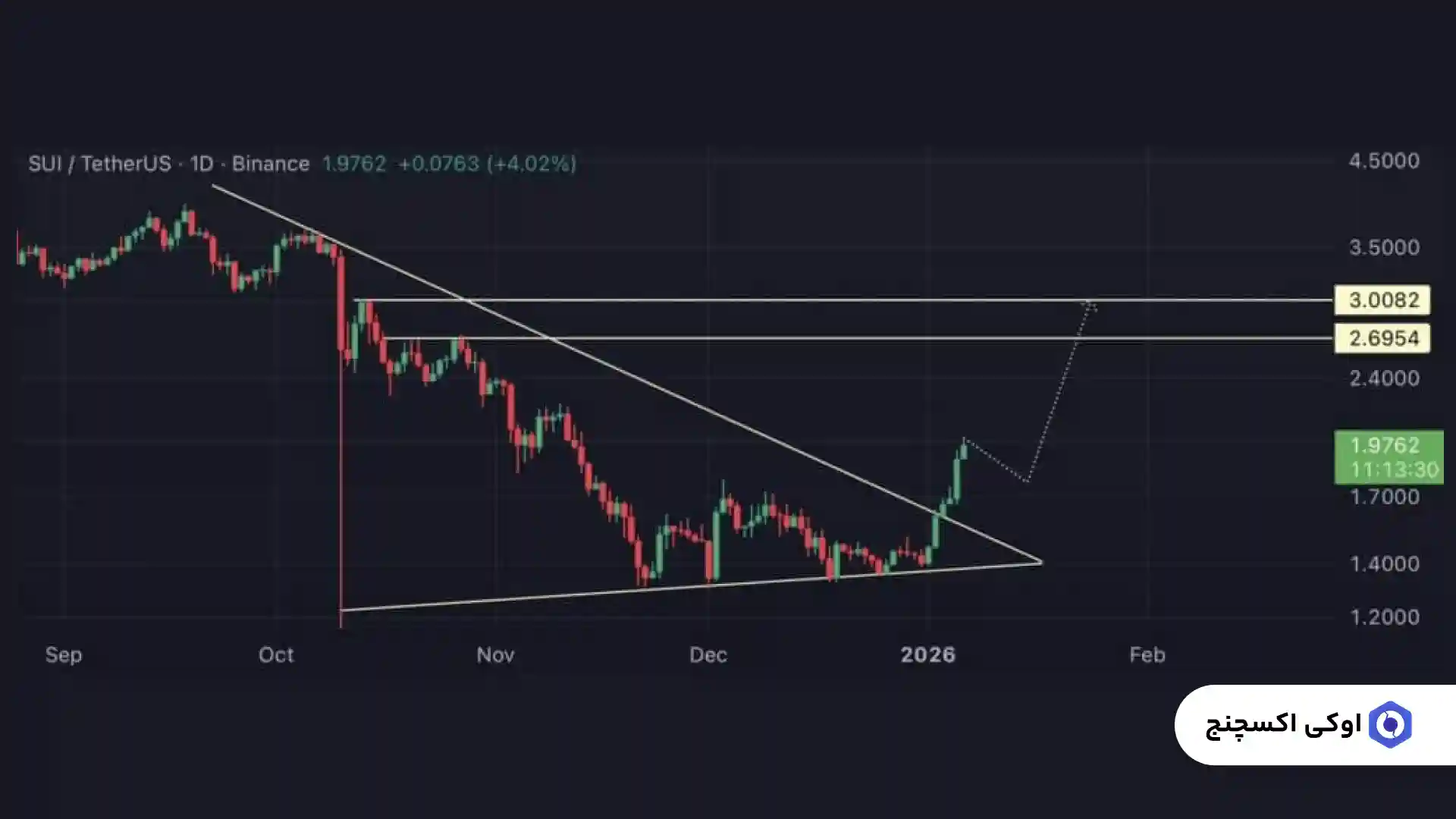 از نظر تحلیل تکنیکال نیز نشانههای صعودی برای قیمت سویی دیده میشود. نمودار روزانه ارز SUI نشاندهنده یک شکست (Breakout) از الگوی کنج نزولی بلندمدت است؛ الگویی که معمولاً پس از ماهها تشکیل سقفهای پایینتر، بهعنوان یک تغییر ساختار صعودی شناخته میشود.