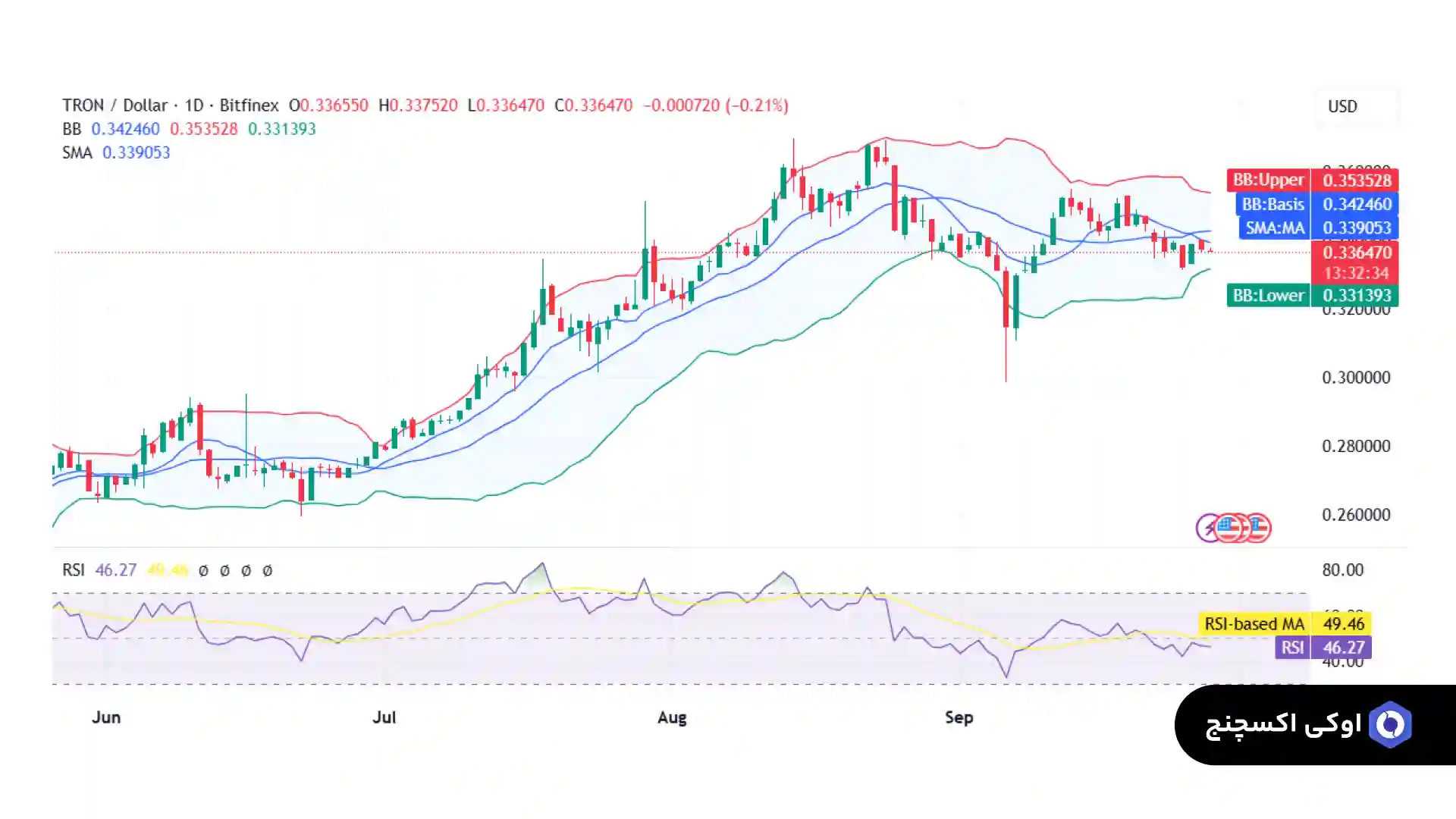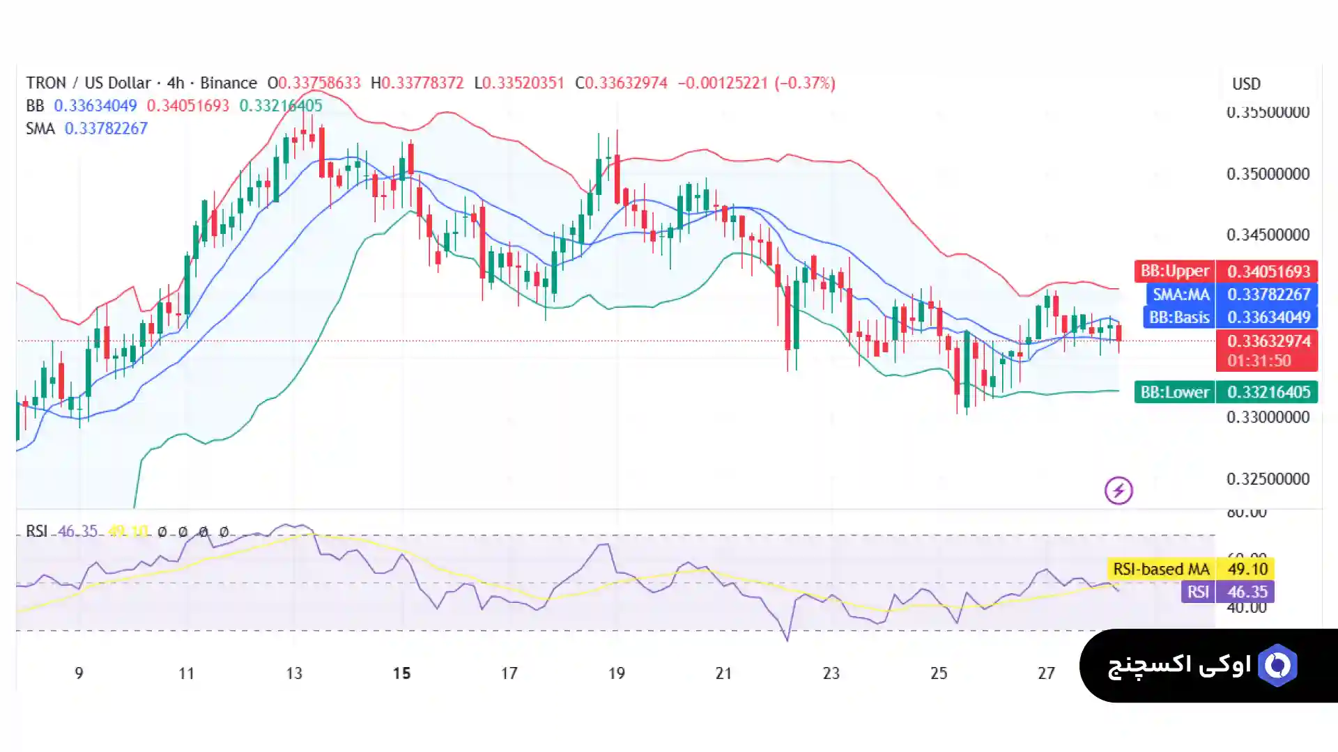 فاصله بین باندهای بولینگر، نوسانات را تعریف می کند. این فاصله زیاد است و منجر به افزایش نوسانات می شود. علاوه بر این، حد بالایی شاخص باندهای بولینگر که به عنوان سطح مقاومت عمل می کند، به ۰.۳۵۳ دلار تغییر یافته است. در حالی که حد پایینی آن، که به عنوان سطح حمایت شناخته میشود، به ۰.۳۳۱ دلار تغییر کرده است.