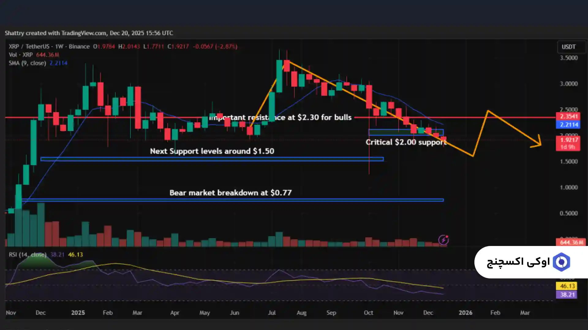 در حال حاضر، قیمت ارز XRP کمی بالاتر از سطح حمایت مهم ۲ دلار قرار دارد؛ سطحی که چندین بار آزمایش شده و همین موضوع احتمال شکست آن را افزایش می دهد. شاخص RSI نیز روندی نزولی دارد و در محدوده بالای ۳۰ قرار گرفته که بیانگر فشار فروش مداوم و نبود تمایل قوی برای خرید در کف قیمت است.