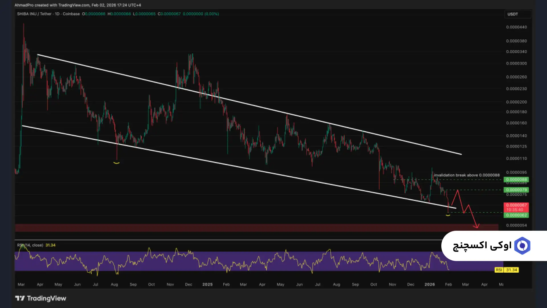 • ادامه روند نزولی: اگر فشار فروش بیشتر شود، حمایت بعدی در سطح ~۰.۰۰۰۰۰۶۰ دلار دیده می‌شود.