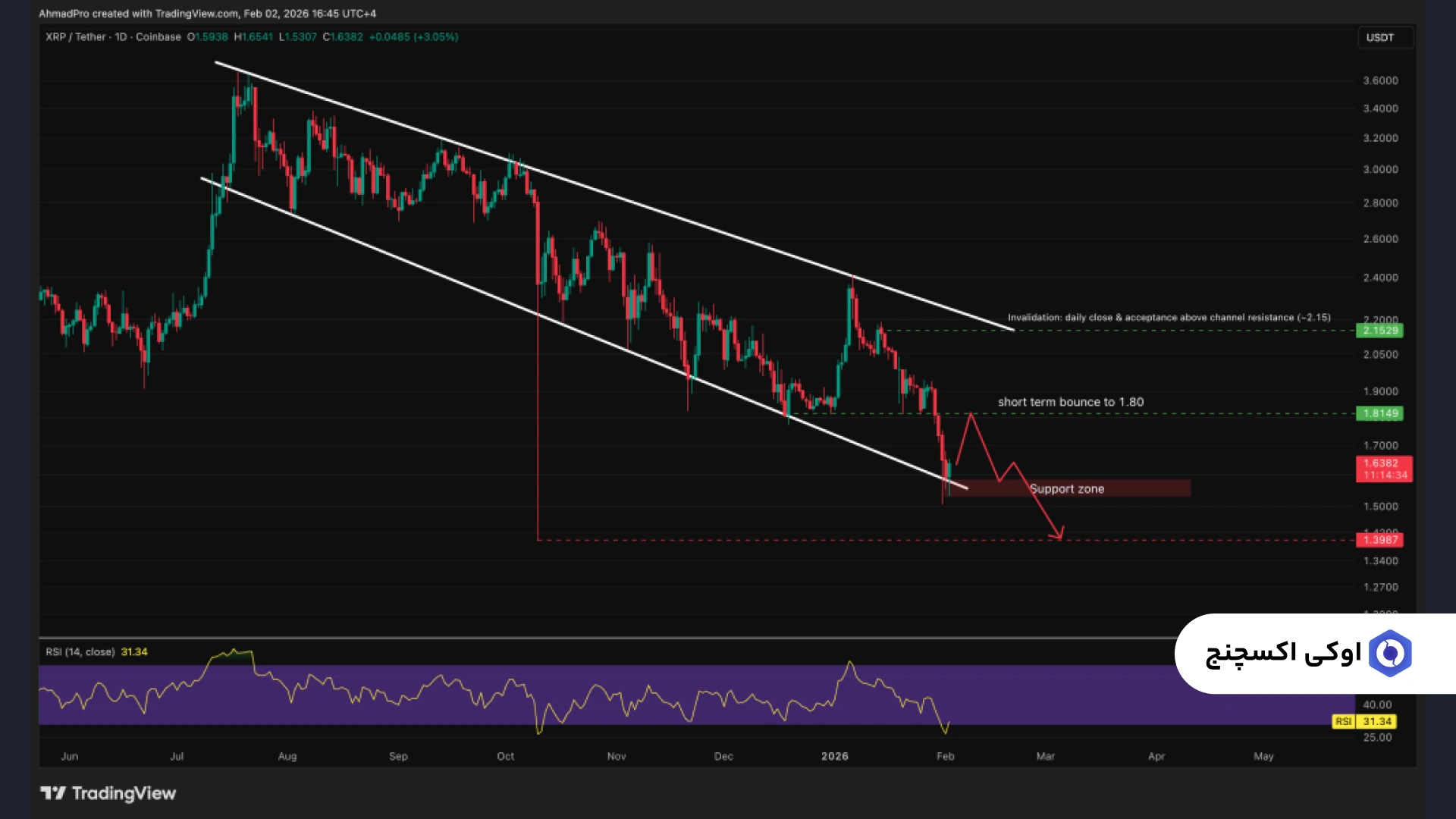 قیمت ریپل (XRP) در کف یک الگوی نزولی بلندمدت قرار گرفته و شاخص RSI وارد محدوده oversold (فروش هیجانی) شده است. این سیگنال اغلب به معنای احتمال بازیابی قیمتی کوتاه‌مدت (relief bounce) است.