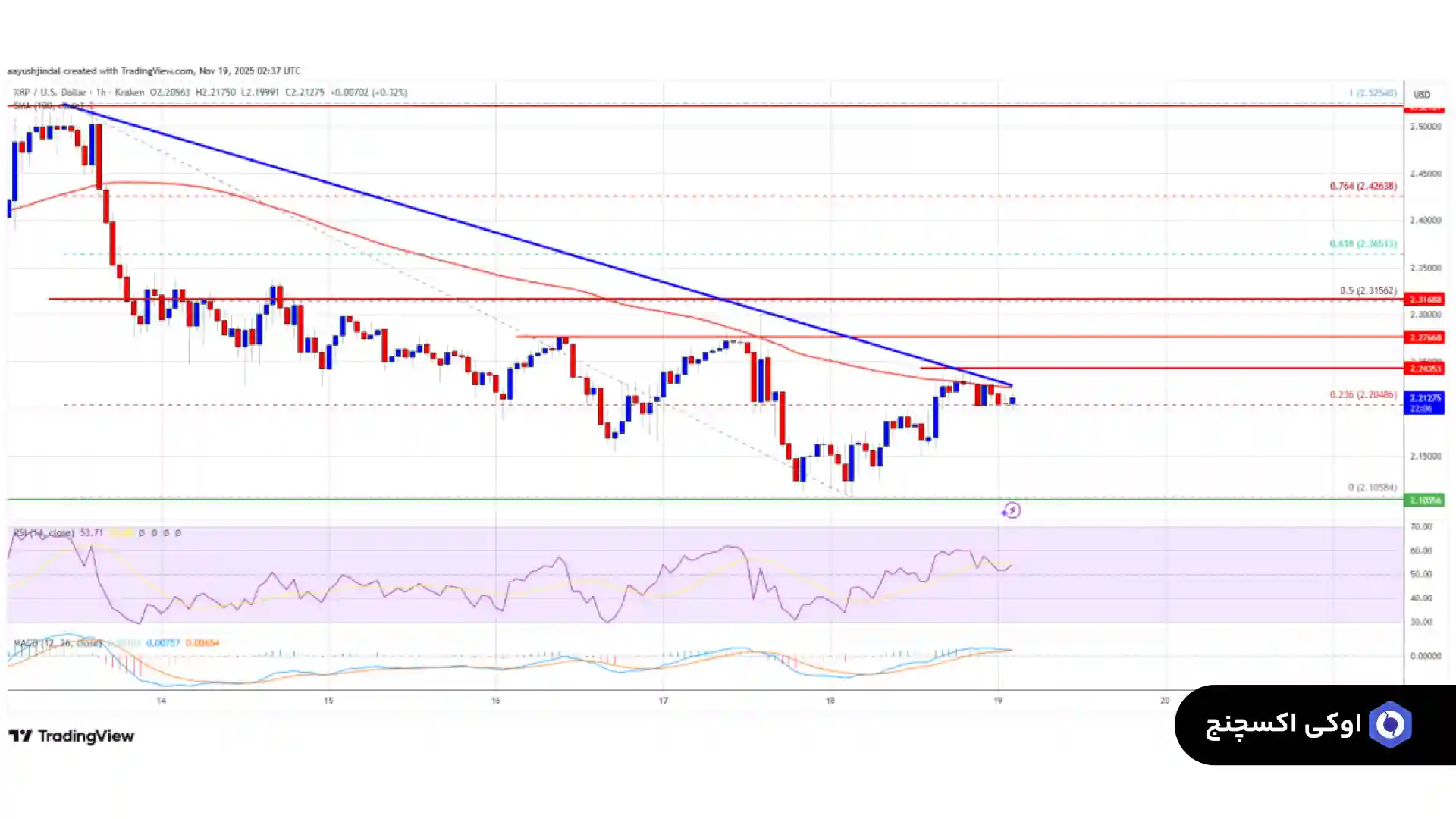 در نمودار ساعتی ارز XRP یک خط روند نزولی با مقاومت ۲.۲۲ دلار تشکیل شده است. اگر این ارز زیر ۲.۱۰ دلار قرار گیرد، می تواند به حرکت نزولی خود ادامه دهد.