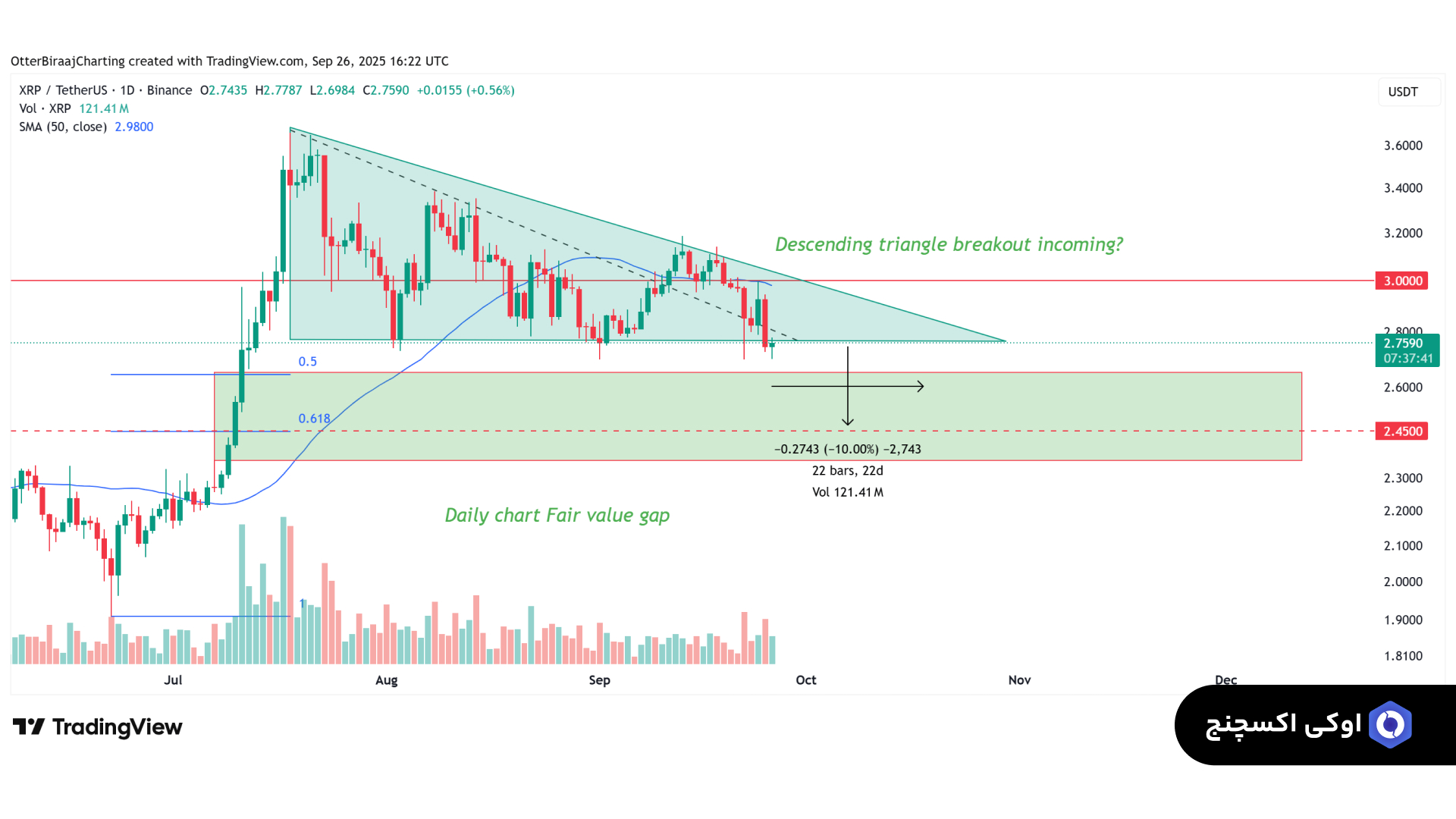 قیمت ارز ریپل (XRP) در یک سطح بحرانی در در نوسان بوده و این آلت کوین (Altcoin) در پایهی یک مثلث نزولی ، تثبیت شده است. این رمزارز در محدوده سطح حمایتی ۲.۷۵ دلار در نوسان بود، اما فشار فروش پایدار می تواند قیمت ریپل در آینده را به سمت محدوده ۲.۶۵ تا ۲.۴۵ دلار کاهش دهد.